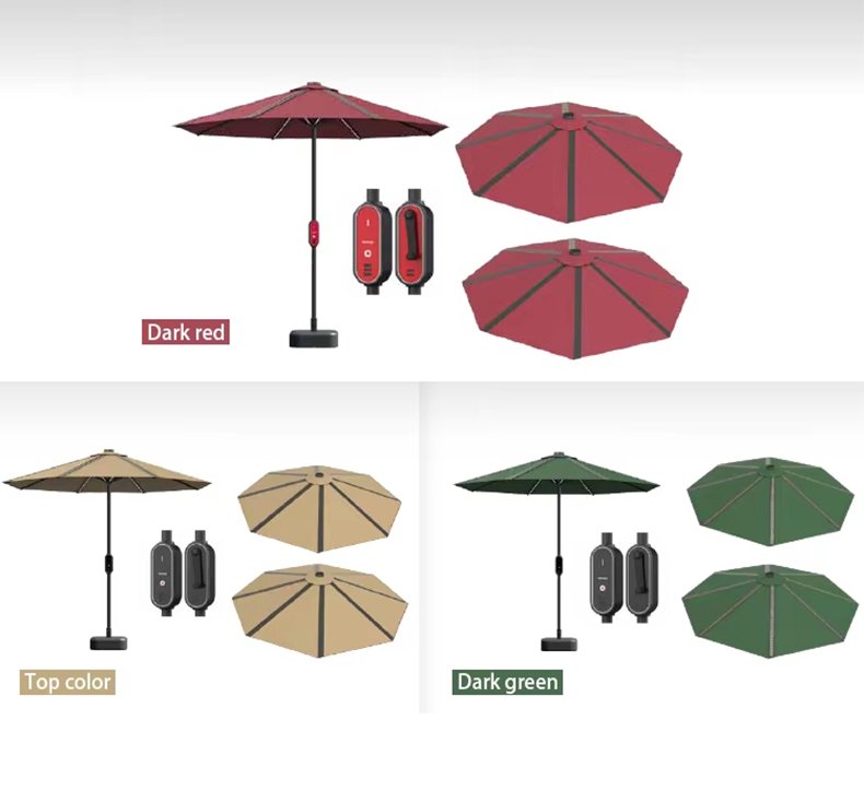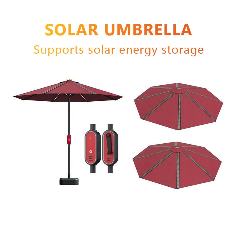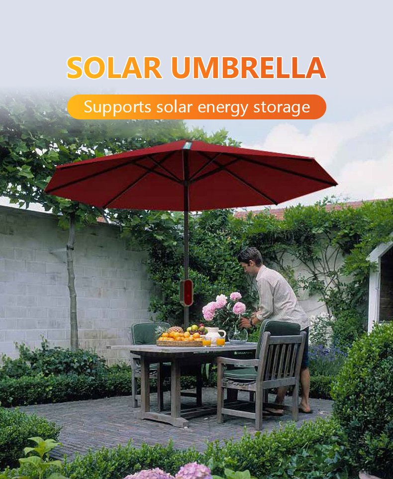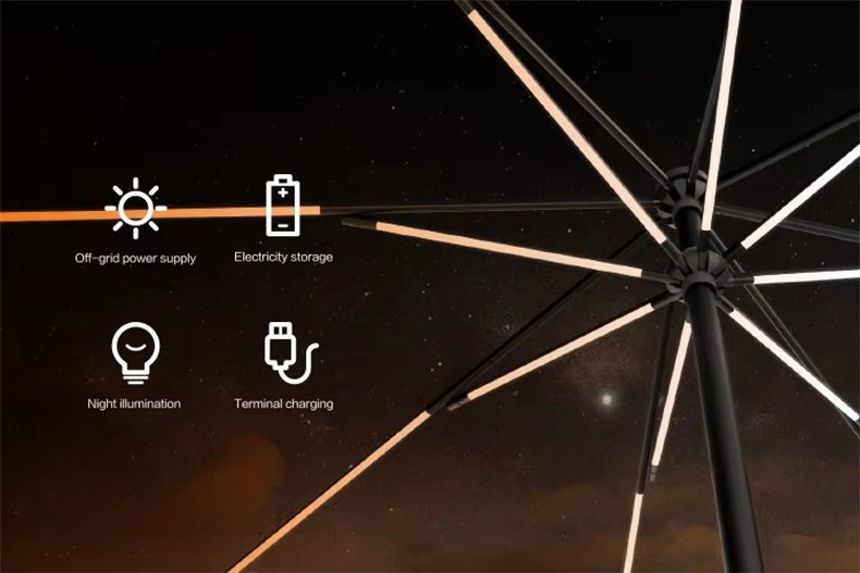 Thin film solar power umbrella, not only has the function of sunshade and rain protection of outdoor umbrella, but also a layer of high-efficiency flexible thin film solar chip laid on the surface, so that solar umbrella has power generation function regardless of sunshine or cloudy. Solar umbrella has four advantages of off-grid power supply, super large energy storage, night lighting and terminal charging, which can light up technology life at any time